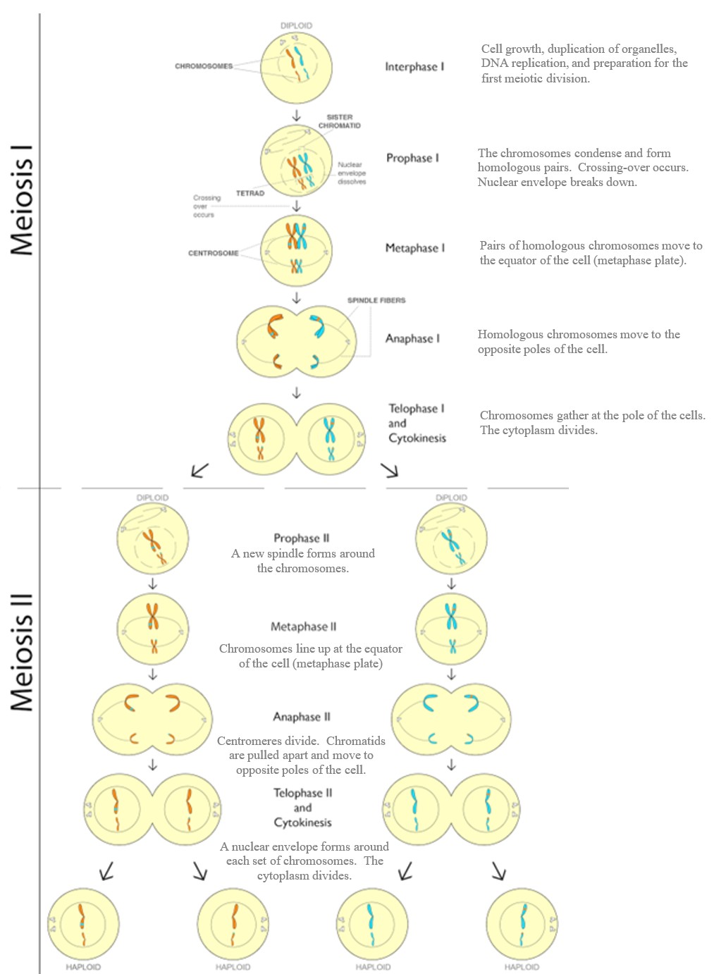 Figure 8.3: Meiosis consists of two stages: meiosis I and meiosis II. Meiosis begins with one diploid parent cell and results in 4 haploid daughter cells.