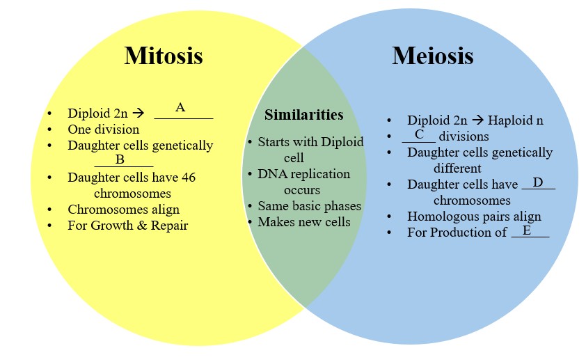 Fill in the missing information in the Venn Diagram that compares the processes of mitosis and meiosis. Record your answers on the Lab Report.