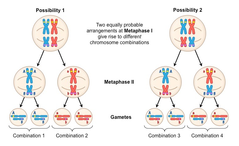 Figure 8.5: The orientation of each homologous pair is random and is not affected by the orientation of any other homologous pair. This gives rise to different chromosome combinations.