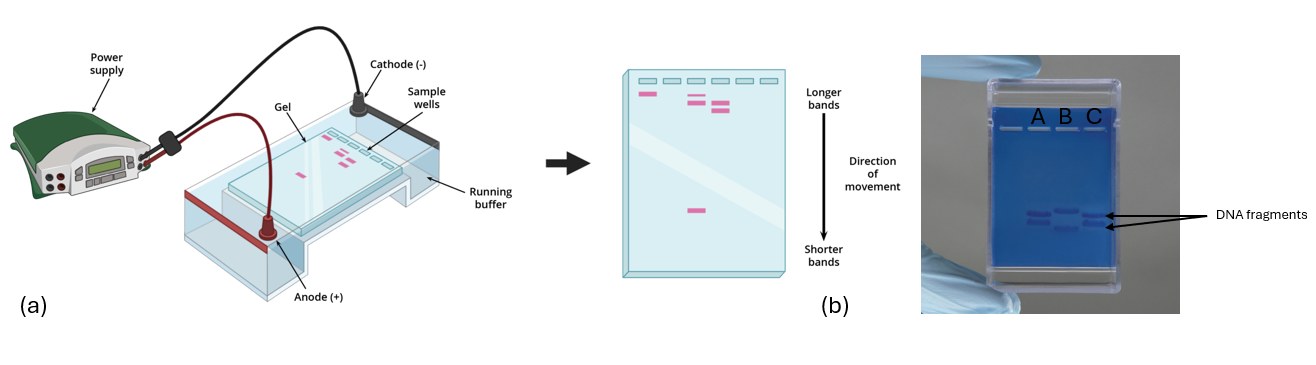 Figure 11.6: (a) The gel chamber is connected to a power supply to provide the electricity that travels from the negative electrode (cathode) to the positive electrode (anode), which allows the movement of DNA fragments. Smaller DNA fragments form bands that travel further than larger DNA fragment bands. (b) On the right is an example of a stained gel where Lane A and Lane C have matching DNA fingerprints.