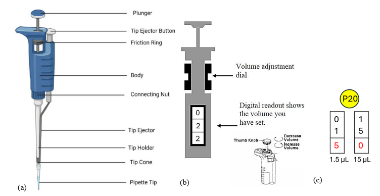 Figure 11.7: (a) Labeled micropipette, (b) how to adjust the volume of a micropipette, (c) how to measure 1.5 µL versus 15 µL on a P20 micropipette. The red digit represents tenths of a microliter (the digit that comes after the decimal point).
