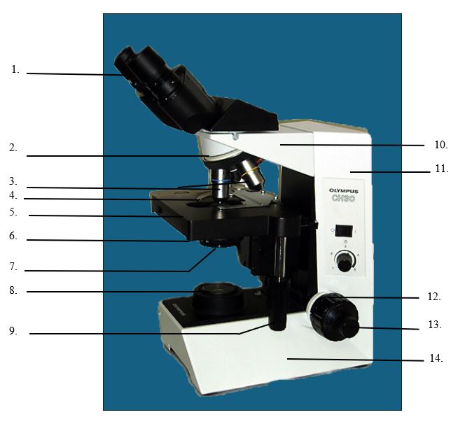 Obtain a compound light microscope from the microscope cabinet, carrying it properly, and place it securely on the lab bench. Label the light microscope, using the text that follows.