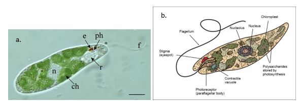 - Use Figure 1.8 a to help identify the structural details of Euglena. Compare your Euglena specimens with Figure 1.8 b. List the labeled features that you can see on the Lab Report.